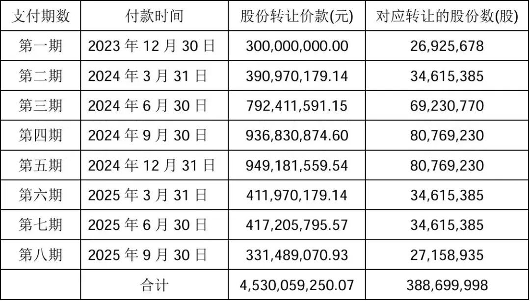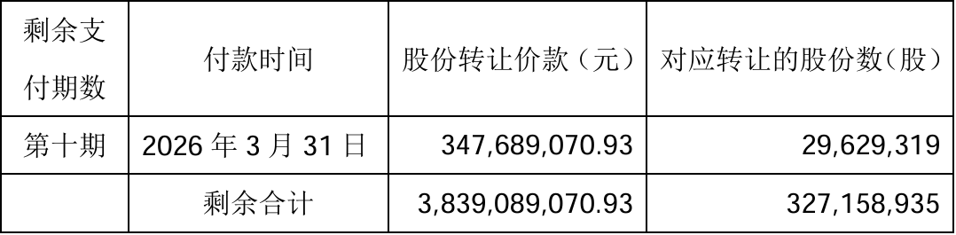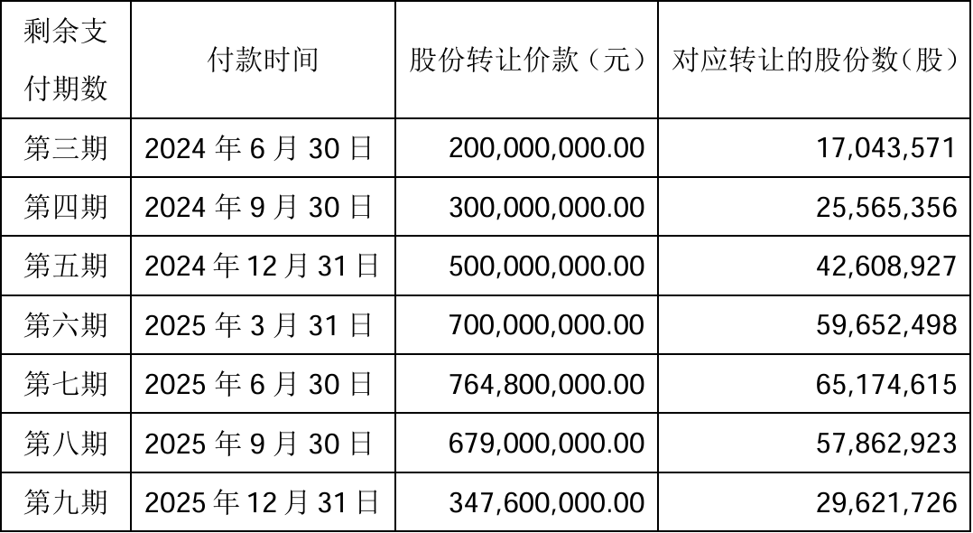 根据调整方案,第三期股份转让价款和后续几期款项,共38.39亿元,将继续分8期执行,付款周期较之前延长了半年,最后一次付款时间从2025年9月30日,延期至2026年3月31日。